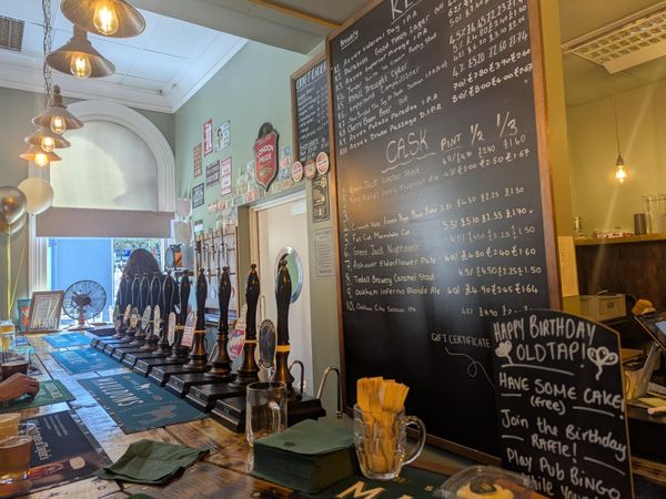 Town centre bar in a former bank building that has been completely refurbished inside with a hand built bar. There are bar stools and seating in the bar area with additional seating in a side room. 10 hand pumps and 10 craft taps serve an ever-changing range of ales with a fridge containing ale and cider in bottles and cans. Beer tasting events are held monthly.