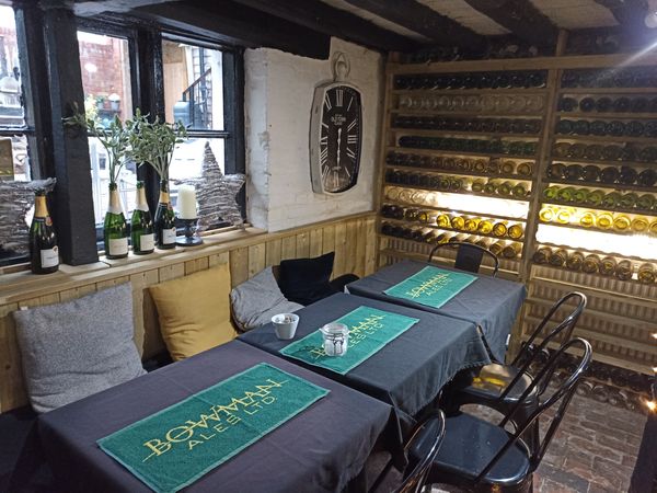A hidden taproom in the cellar of No.60 Coffee & Wine Bar, opened on Thursday 28th November 2024. The entrance is around the corner in Bank Street, which leads to a patio area with seating. In the corner down a couple of steps is the entrance to the taproom. The taproom is a small room with racks of wine bottle racks on two walls. One to three beers direct from the cask, exclusively from Bowman Ales, are ordered/served through a small hatch in the wooden door at the end of the room (if hatch is closed order at the coffee shop upstairs). Food during the day is from the coffee shop upstairs, whilst cold meats and cheese is available in the evening. Please note that fresh casks are put on for Thursday/Friday but may not last through to all of Sunday.